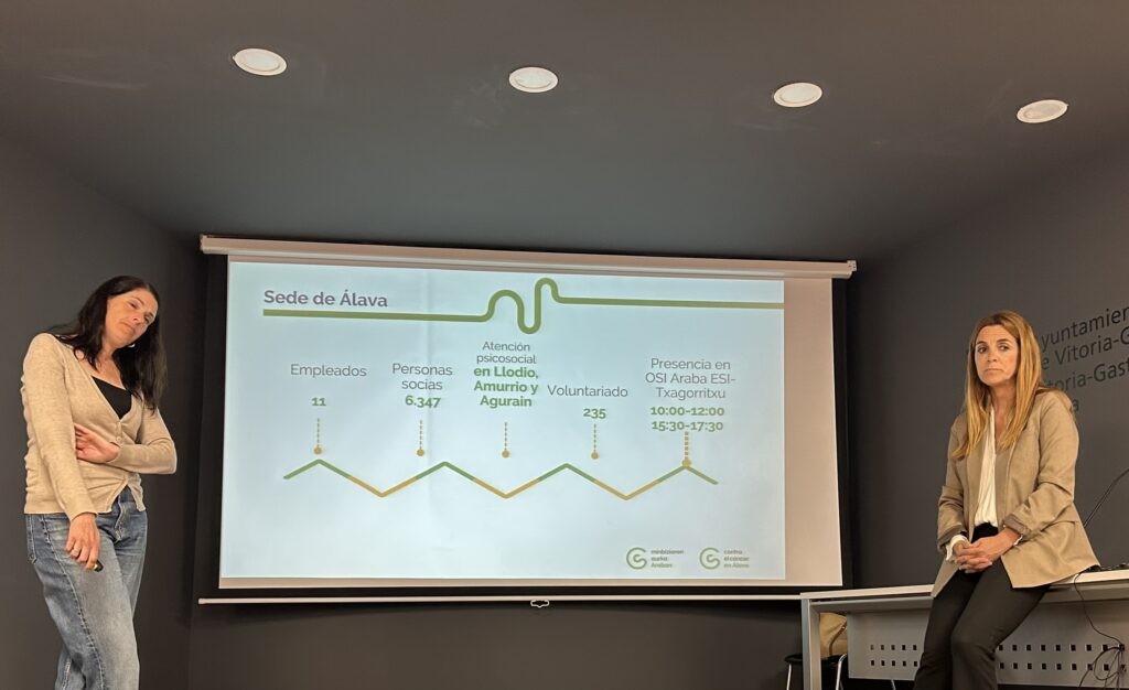 La gerente de la Delegación AECC, Mónica Moreno —acompañada por la Coordinadora de Voluntariado, Zuriñe González de Miguel— nos expusieron los objetivos, actividades y servicios que ofrece la Asociación AECC, específicamente en nuestro territorio —Agurain, Amurrio, Llodio, OSI Araba, ESI Txagorritxu—
